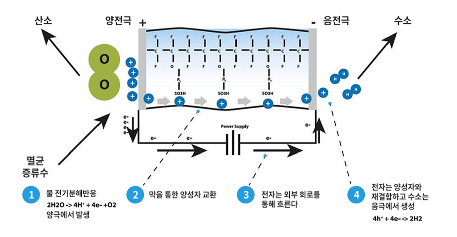 이 시스템은 PEM (Proton Exchange Membrane) 에 의해 탈 이온수(정류수) 구성 부분을 분리합니다. 물과 양이온이 구획 사이를 교차하는 것을 허용하며, 또한 멤브레인은 셀의 전해질 역할을 함으로써 농축된 수산화 나트륨, 칼륨과 같은 위험한 액체 전해질이 필요 없어집니다.
